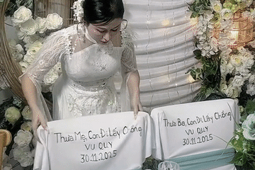 Phía sau hình ảnh 2 chiếc ghế bọc vải trắng, ghi dòng chữ “Thưa mẹ, con đi lấy chồng”, “Thưa ba, con đi lấy chồng” là câu chuyện xúc động của cô dâu sinh năm 1988.