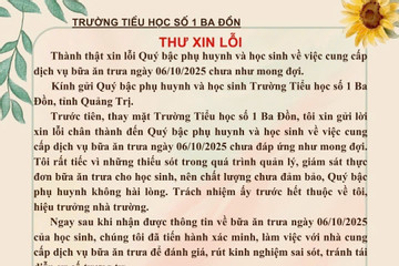 Hiệu trưởng Trường Tiểu học số 1 Ba Đồn (Quảng Trị) vừa gửi thư xin lỗi phụ huynh, học sinh sau khi hình ảnh bữa ăn bán trú chỉ gồm trứng luộc và vài miếng chả, trị giá 2...